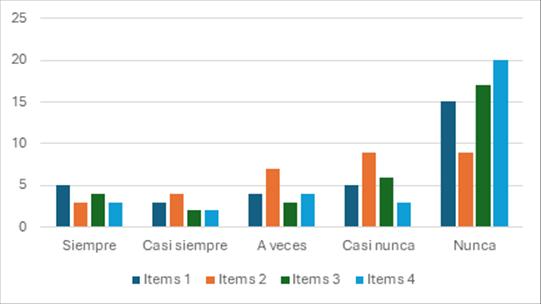 No obstante, el ítem 14 presenta una distribución más equilibrada, con un 37,5 % en la categoría más alta y porcentajes relevantes en niveles intermedios, lo cual sugiere que, aunque el valor de la santidad está presente, aún existen estudiantes que lo practican de forma ocasional o parcial. La presencia de porcentajes bajos en las categorías inferiores indica que son pocos los estudiantes que no manifiestan este valor, pero también pone de relieve la necesidad de reforzar su comprensión y aplicación práctica. En términos generales, los resultados permiten concluir que la santidad es un valor reconocido y practicado por la mayoría, aunque requiere ser fortalecido mediante estrategias pedagógicas continuas que favorezcan su vivencia consciente y constante dentro del contexto escolar.