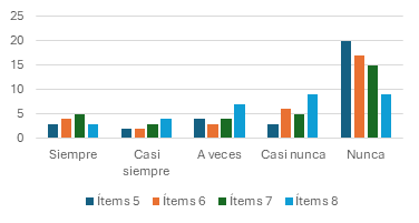 En cuanto al ítem 7, aunque el porcentaje en la categoría superior desciende al 46,88 %, continúa siendo el valor más representativo, lo que evidencia una percepción favorable, aunque con mayor dispersión en las respuestas intermedias. Por su parte, el ítem 8 presenta una distribución más equilibrada, donde el 28,13 % se concentra en las categorías altas, seguido de un 21,88 % en opciones intermedias, lo que sugiere que, si bien la humildad está presente, su práctica no es uniforme en todos los estudiantes. En conjunto, los resultados permiten inferir que la humildad se manifiesta de forma relevante en el grupo estudiado, aunque existen matices en su nivel de interiorización y aplicación cotidiana.