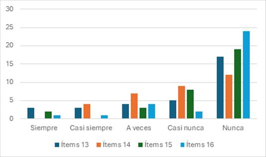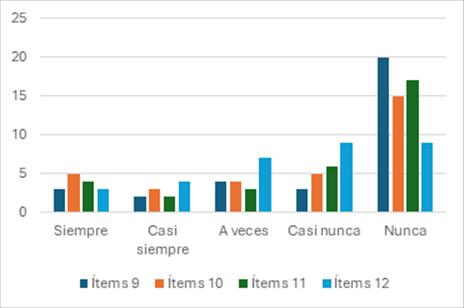 En el ítem 10, aunque el porcentaje más alto (46,88 %) se mantiene en la categoría superior, se aprecia una mayor dispersión en las respuestas intermedias, lo que sugiere que la práctica de la justicia no es constante en todos los casos. Por su parte, el ítem 11 presenta un comportamiento similar, con un 53,13 % en la opción de mayor puntuación, reafirmando una percepción positiva respecto al respeto de normas y trato equitativo entre compañeros.