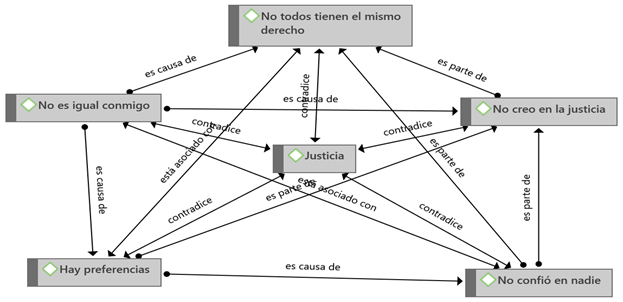 En la figura 2, la categoría revela una contextura de pensamientos interconectados en torno a la justicia y la confianza, coexiste una percepción de desigualdad que genera idea de que la justicia no es imparcial, lo que a su vez provoca susceptibilidad en el sistema educativo o en el individuo, este entramado de relaciones dejar ver cómo la percepción de la justicia influye directamente en la confianza individual y colectiva.