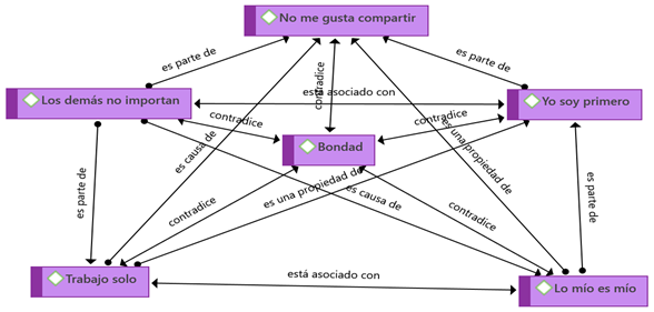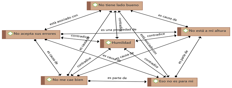 Esta malla, relacionada con cinco codigos de relación, se evidencia cómo la humildad se confronta con una actitudes de superioridad, falta de autocrítica ademas de ello de rechazo hacia los demás personas. La distancia de humildad no solo paraliza el desarrollo propio del estudinate en este caso, sino que también afecta la percepción y el trato hacia las demás personas, creando barreras en la convivencia social.