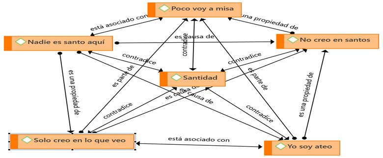 Esta imagen de la malla, está conformada por cinco códigos (elementos o creencias relacionadas con la santidad); estos códigos permiten analizar cómo las personas responden ante la idea de santidad y sus respuestas se relacionan entre sí. la mayoría de los informantes clave, no poseen una tipología que permita ir más allá de ciertas creencias, su percepción está influenciada por creencias limitadas o específicas. Lo que esto permitió identificar relaciones y contradicciones entre creencias expresadas por los participantes, hay una tendencia hacia el escepticismo respaldado por las respuestas obtenidas en el estudio.