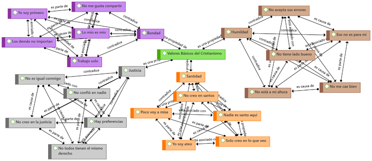 Los resultados del análisis mediante redes estructurales o semánticas evidencian la complejidad con la que los valores del cristianismo se manifiestan y se interrelacionan en el contexto educativo. Las mallas de relaciones permitieron visualizar de manera clara cómo cada categoría, bondad, justicia, humildad y santidad, no opera de forma aislada, sino que se encuentra profundamente influenciada por percepciones, actitudes y creencias construidas socialmente; en este sentido, el uso de redes semánticas facilitó la identificación de tensiones internas entre los valores promovidos y las prácticas reales observadas en los estudiantes.