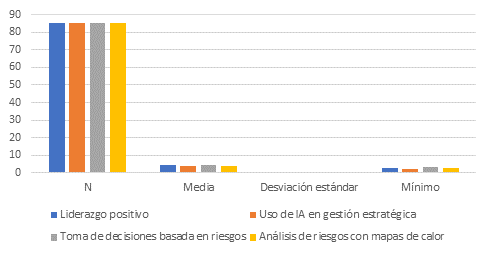 Los resultados descriptivos evidencian valores medios altos en todas las variables analizadas, lo que indica una presencia significativa del liderazgo positivo y una alta incorporación de herramientas de inteligencia artificial en la gestión estratégica. La variable con mayor media corresponde a la toma de decisiones basada en riesgos (M = 4,25), lo cual sugiere que los directivos priorizan el análisis estructurado de riesgos operativos y financieros como base para sus decisiones. La baja dispersión observada refleja homogeneidad en las percepciones de los participantes, lo que fortalece la consistencia de los resultados.