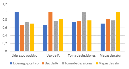 El análisis de varianza (ANOVA) indica diferencias estadísticamente significativas en la efectividad de la gestión estratégica según el nivel de uso de inteligencia artificial (p < 0,001). Las organizaciones con alto nivel de integración de IA y mapas de calor presentan mayores puntajes en efectividad estratégica, lo que confirma el impacto positivo de estas herramientas cuando son acompañadas por un liderazgo positivo y una cultura organizacional orientada a la innovación y la gestión ética del riesgo.