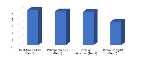 Al examinar los resultados de esta dimensión, se evidencia que la institución presenta un posicionamiento de marca consolidado, alcanzando una media general de 4.53, lo que la ubica en una categoría Muy Alta. Este resultado refleja una percepción favorable por parte de los usuarios, quienes reconocen atributos diferenciadores en la propuesta educativa. En particular, el Ítem 3, relacionado con la formación en valores éticos y religiosos, obtuvo la puntuación máxima (5.00), lo que confirma que la identidad axiológica constituye el principal elemento distintivo de la institución, generando una conexión significativa con las familias.