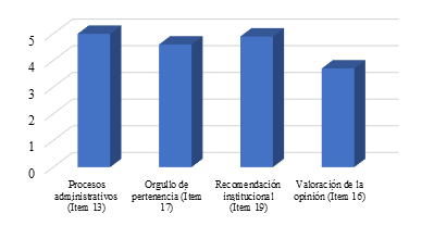 No obstante, al analizar los aspectos relacionales, el Ítem 16, relacionado con la valoración de la opinión de los representantes, presenta una media de 3.70, siendo inferior al resto de los indicadores. Este resultado sugiere que, aunque existe un alto nivel de satisfacción general, los usuarios perciben limitaciones en los espacios de participación y escucha activa. Al contrastar este dato con el alto nivel de orgullo de pertenencia y la intención de recomendación, se infiere que la fidelización actual se fundamenta en la calidad del servicio, pero requiere fortalecerse en su dimensión participativa.