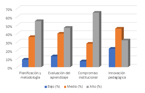 Se observa que el compromiso institucional presenta el nivel más alto con un 65 %, lo que indica una fuerte identificación del docente con la institución; la planificación pedagógica también muestra resultados favorables; no obstante, la innovación pedagógica presenta el porcentaje más bajo en nivel alto (32 %), lo que evidencia resistencia al cambio o limitaciones en la incorporación de nuevas estrategias didácticas; esto sugiere que, aunque existe responsabilidad y cumplimiento, aún se requieren mejoras en la actualización pedagógica.