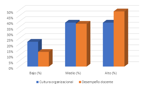Los resultados generales muestran que la cultura organizacional se encuentra mayormente en niveles medio y alto, aunque con una proporción importante en nivel medio, lo que indica oportunidades de mejora; por su parte, el desempeño docente presenta una tendencia más favorable hacia el nivel alto; esta diferencia sugiere que, aunque los docentes mantienen un buen desempeño, este podría potenciarse aún más si la cultura organizacional se fortalece de manera integral.